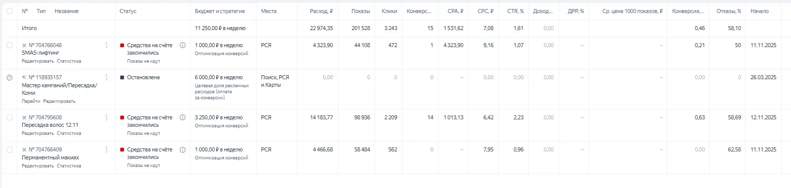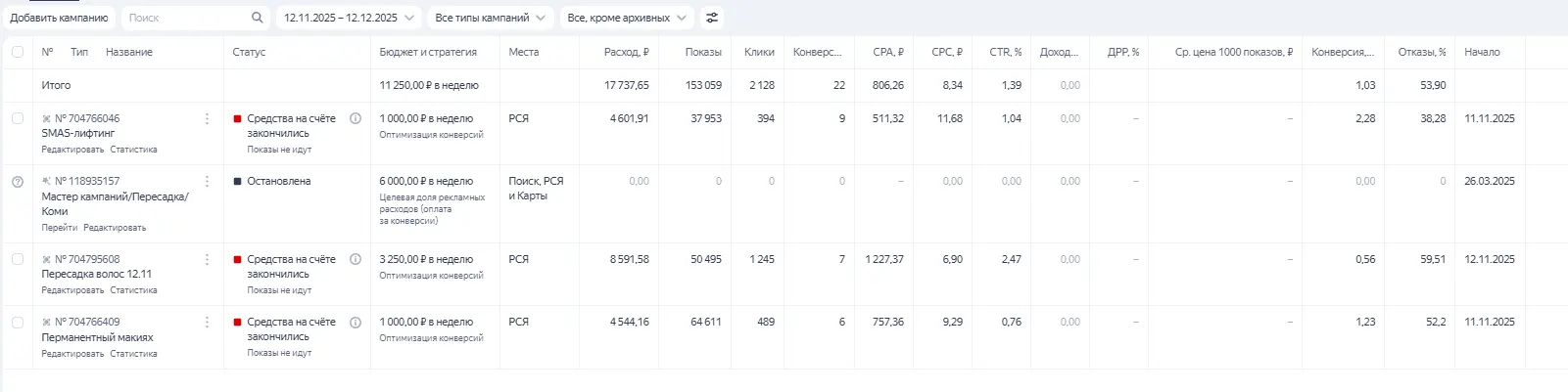 Были запущены и параллельно велись 3 рекламные кампании в Яндекс Директ